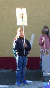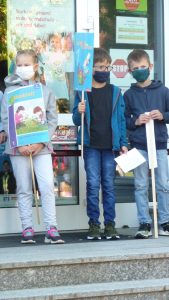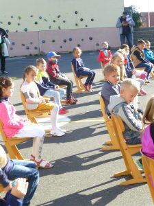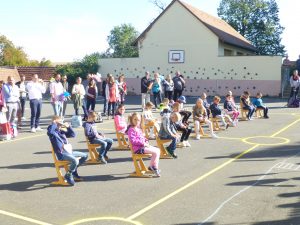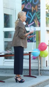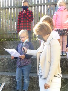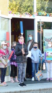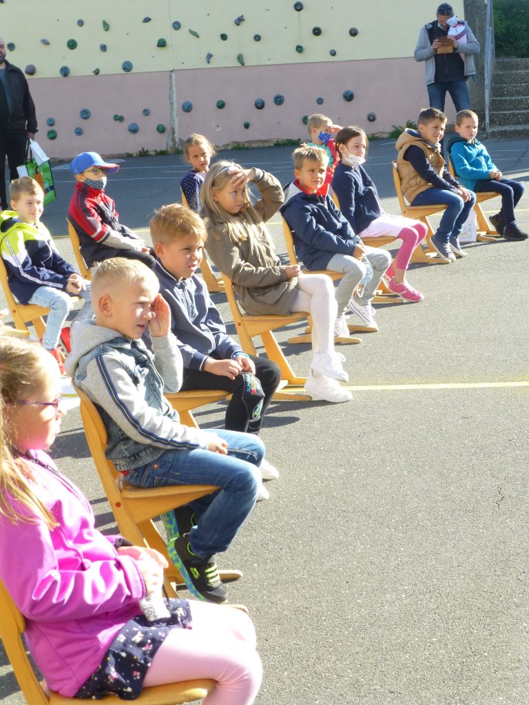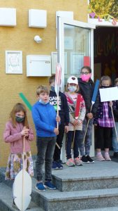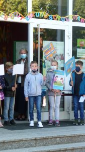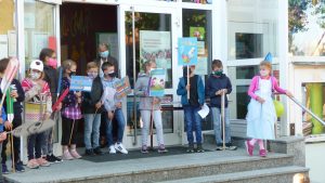 Nach einer Corona bedingt als Rap gesprochenen Begrüßung, lauschten die 41 neuen Erstklässler gespannt dem Streit der Schulsachen, wer denn nun am Wichtigsten sei. Der Streit, vorgetragen von Schülerinnen und Schülern der 2. und 3. Klasse, endete mit der Feststellung, dass alle gleich wichtig sind.