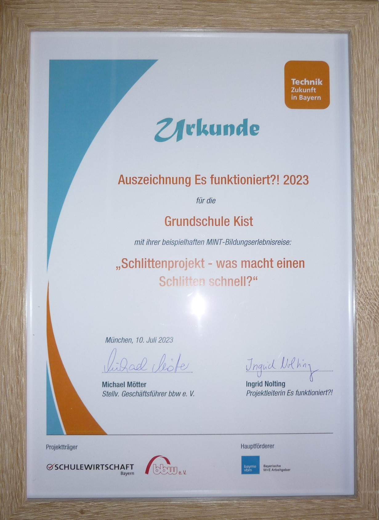 „Was macht einen Schlitten schnell?“ Diese Frage stellten die Kinder der Klasse 3b der Grundschule Kist als Startschuss für die dreimonatige Projektarbeit, in der sie gemeinsam gestaunt, entdeckt und geforscht haben. Mit Unterstützung ihrer Bildungsbegleiterin Frau Knaup haben sich die kleinen Forscher auf eine spannende MINT-Bildungserlebnisreise begeben. Dieses Engagement wird nun mit der bayernweiten Auszeichnung „Es funktioniert?!“ gewürdigt. Es funktioniert?! ist ein Projekt der Bildungsinitiative Technik – Zukunft in Bayern des Bildungswerks der Bayerischen Wirtschaft (bbw) e. V. Hinter dem Projekt stehen die bayerischen Metall- und Elektro-Arbeitgeberverbände bayme vbm als Hauptförderer.