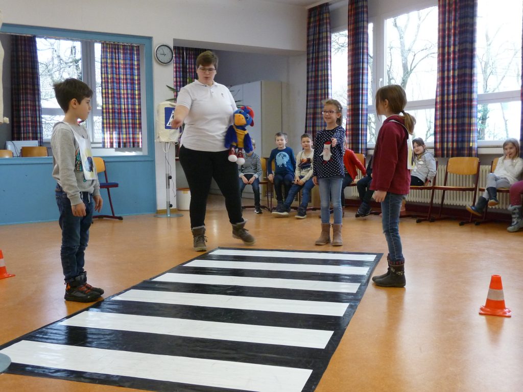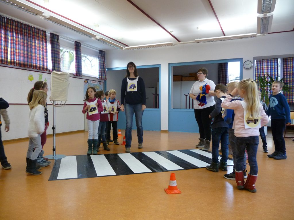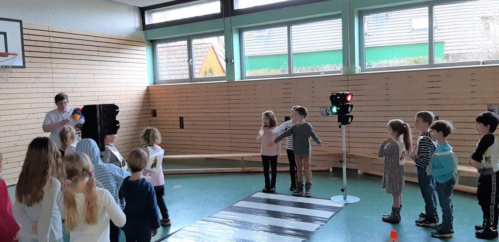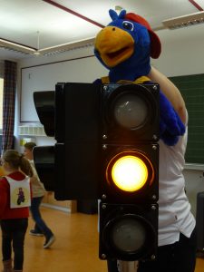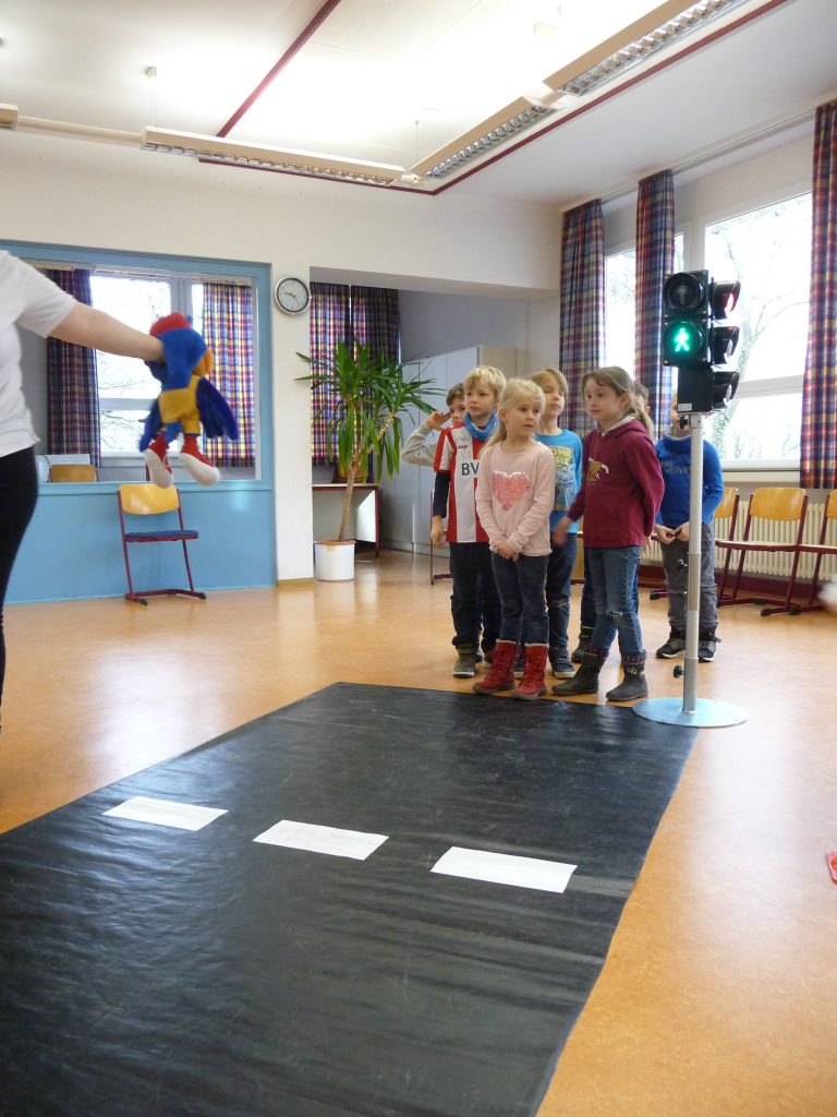 Am Mittwoch, den 12. Februar nahmen die beiden ersten Klassen unserer Schule an einem Verkehrssicherheitsprogramm des ADAC Stiftung teil. Nach dem gemeinsamen Lied „Bei Rot bleib ich steh’n, bei Grün kann ich geh’n“ übten die Kinder zusammen mit der schlauen Handpuppe, dem Raben Adacus, wie man richtig und sicher über die Straße läuft. Einige Kinder wurden zu Autos, die anderen trainierten das richtige Verhalten bei einem Fußgängerüberweg oder der Ampel. Wichtig war vor allem der Blickkontakt mit den Autofahrern. Um die Sache noch etwas schwieriger zu gestalten, fuhren die beiden Klassenlehrerinnen ab und zu auch noch als Polizeiauto mit lautem Martinshorn sogar über die rote Ampel. So konnte an diesem Tag das im Heimat- und Sachunterricht bereits Gelernte noch einmal vertieft und wieder ins Gedächtnis gerufen werden.