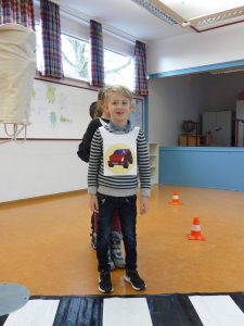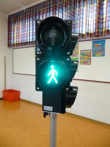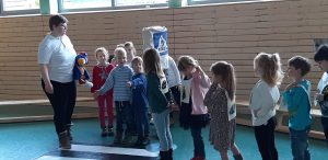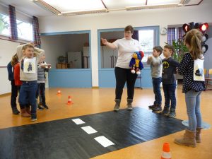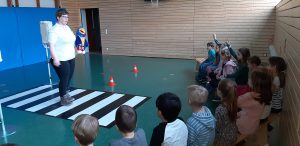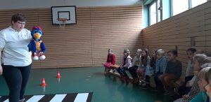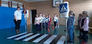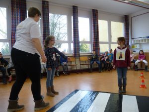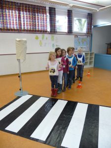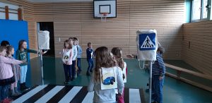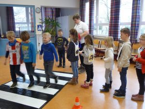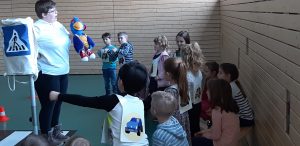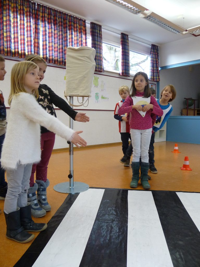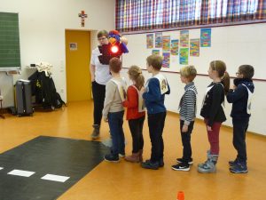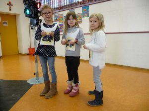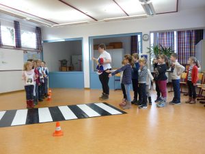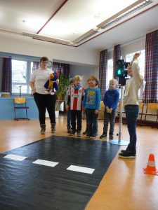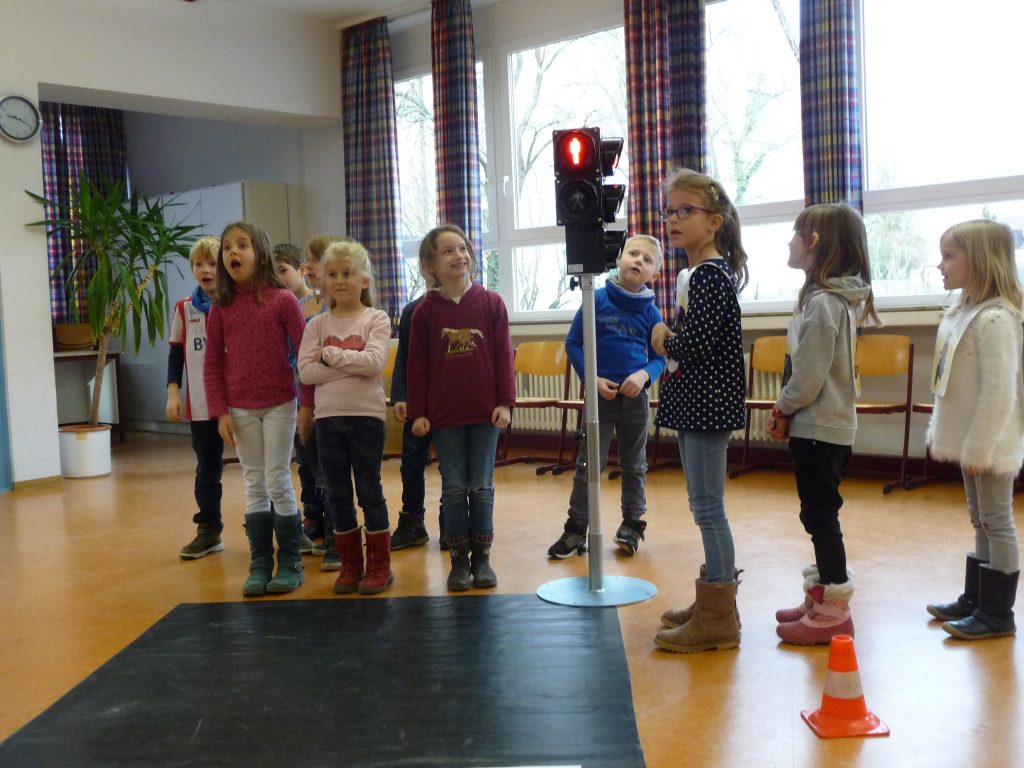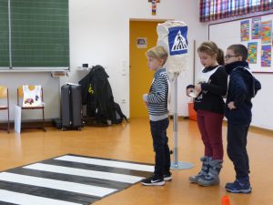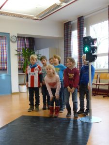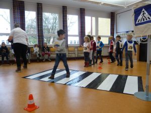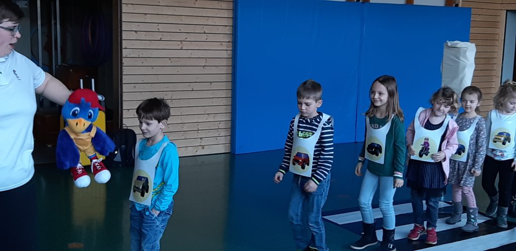 Am Mittwoch, den 12. Februar nahmen die beiden ersten Klassen unserer Schule an einem Verkehrssicherheitsprogramm des ADAC Stiftung teil. Nach dem gemeinsamen Lied „Bei Rot bleib ich steh’n, bei Grün kann ich geh’n“ übten die Kinder zusammen mit der schlauen Handpuppe, dem Raben Adacus, wie man richtig und sicher über die Straße läuft. Einige Kinder wurden zu Autos, die anderen trainierten das richtige Verhalten bei einem Fußgängerüberweg oder der Ampel. Wichtig war vor allem der Blickkontakt mit den Autofahrern. Um die Sache noch etwas schwieriger zu gestalten, fuhren die beiden Klassenlehrerinnen ab und zu auch noch als Polizeiauto mit lautem Martinshorn sogar über die rote Ampel. So konnte an diesem Tag das im Heimat- und Sachunterricht bereits Gelernte noch einmal vertieft und wieder ins Gedächtnis gerufen werden.