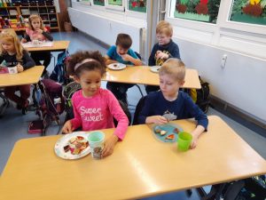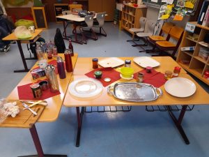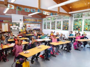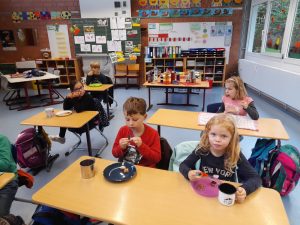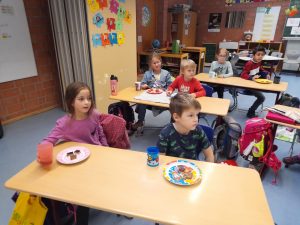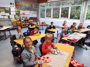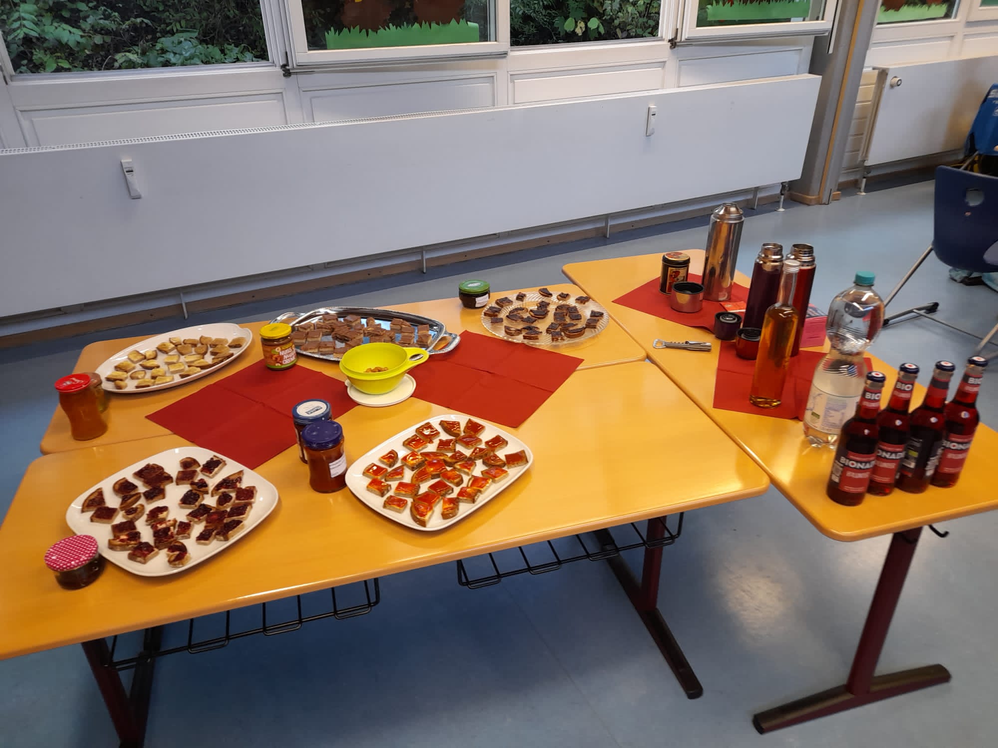Nachdem sich die Klasse 2b im Oktober mit der Hecke, ihren Sträuchern und Früchten beschäftigt hatte, wurde das Thema mit einem gemeinsamen Heckenfrühstück abgeschlossen. Einige Kinder brachten von zuhause selbstgemachte Hagebuttenmarmelade, Brombeermarmelade und Holunderblütengelee mit. Auch ein Haselnussaufstrich durfte nicht fehlen. So konnte alles als leckerer Brotaufstrich gekostet werden. Außerdem probierten die Kinder Holundersaft, Holunderblütensirup, Holundertee, Hagebuttentee und Holunderlimonade. Am Ende waren alle Platten geputzt und die Kinder satt und begeistert.