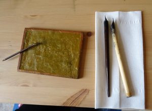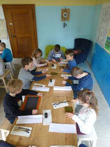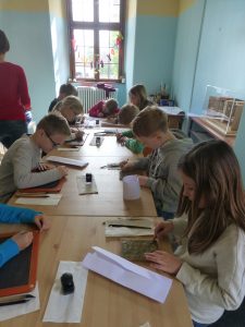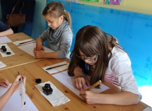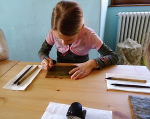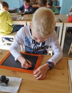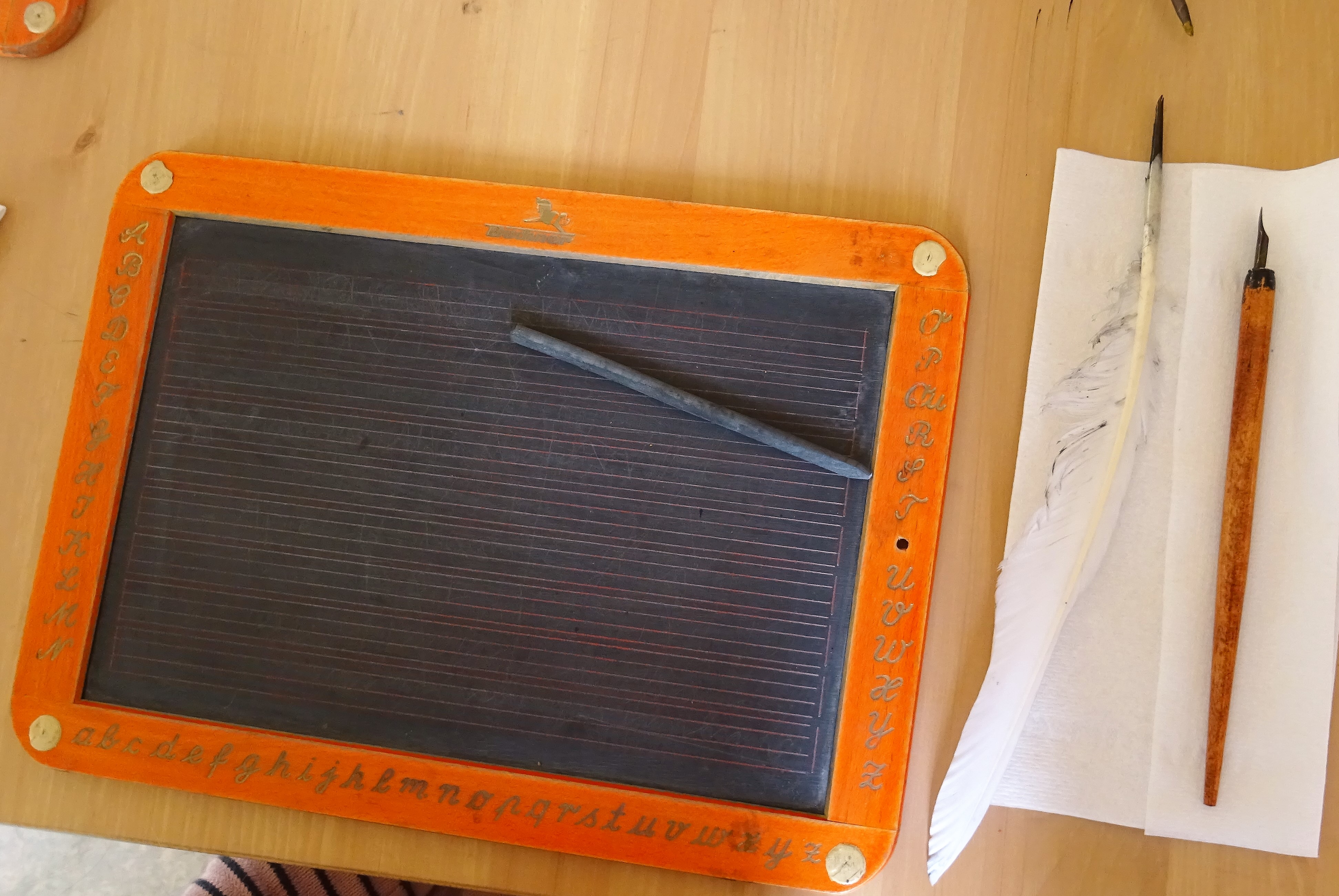 Den Füllerführerschein haben inzwischen alle Zweitklässler bestanden, aber womit schrieben eigentlich die Großeltern, Urgroßeltern oder noch frühere Generationen? Dieser Frage gingen die Kinder am Donnerstag, den 16.5.19 im Museum für Franken nach. Alle Schreibgeräte durften nun ausprobiert werden: mit Griffel auf Schiefertafeln, mit Messerchen auf Wachsbrettern, mit Gänse-, Rohr- und Stahlfeder auf Papier. Ständig mussten die Federn ins Tintenfass getaucht werden, Patronen gab es schließlich noch nicht. Die Griffel dagegen verursachten unangenehme Geräusche beim Schreiben. Mühselig war es auch, die Wachsplatten wieder glatt zu streichen.
