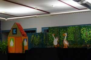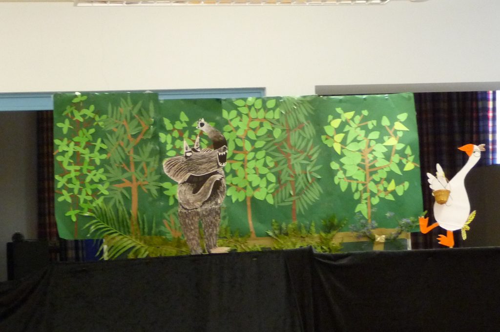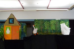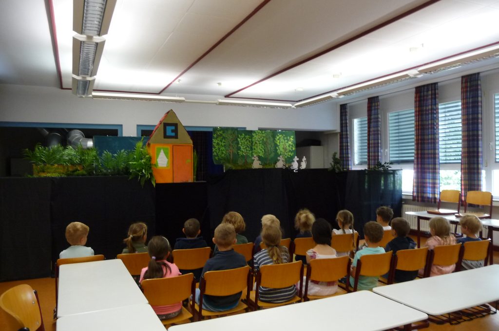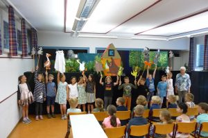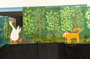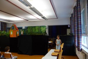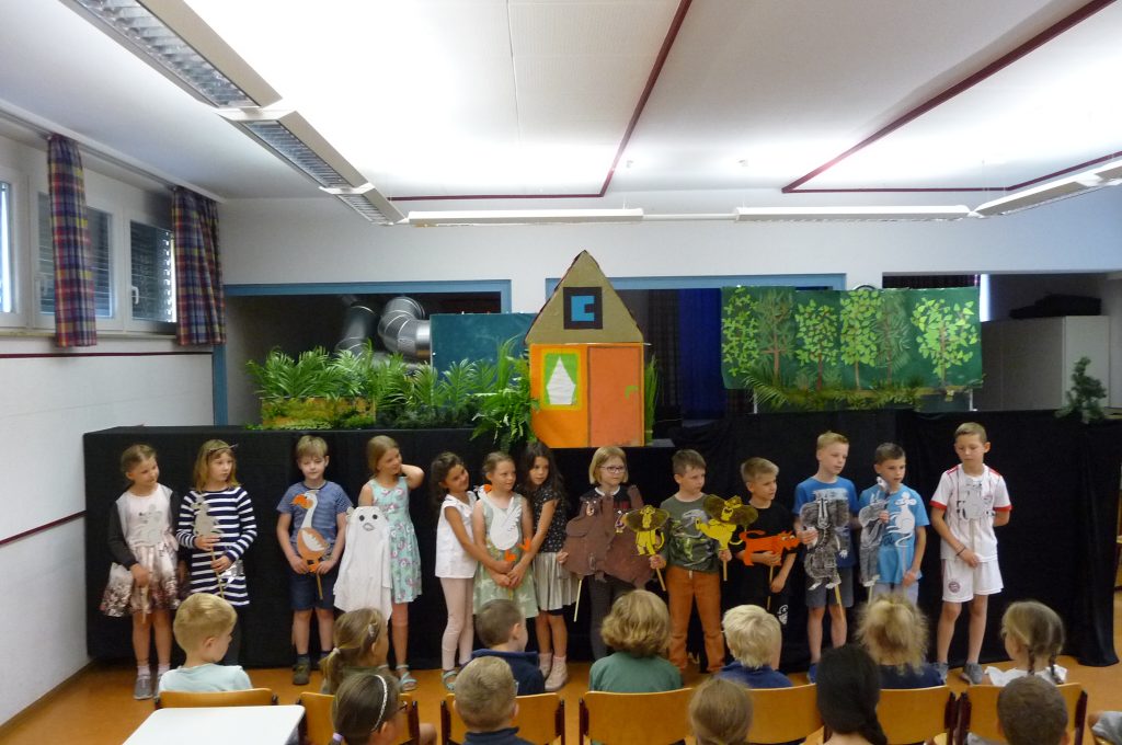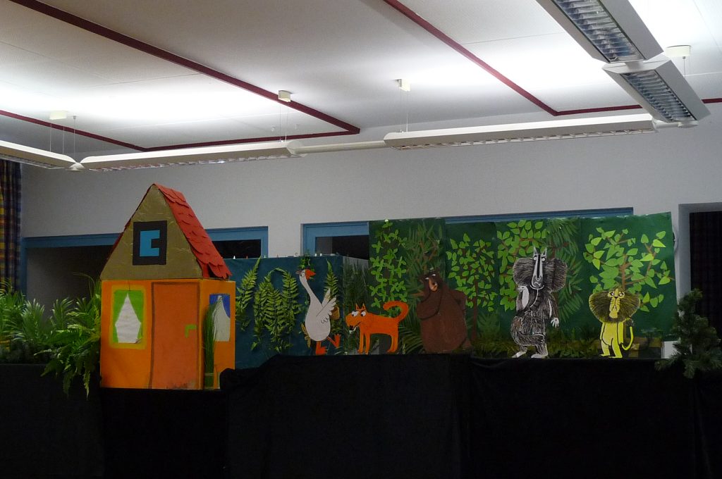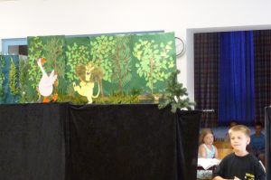 Die Schulspielkinder der 2a übten in den letzten Wochen fleißig das Stabpuppenspiel „Frida Furchtlos lädt zum Tee“ ein. In dem Stück ging es um eine Gans, die im Wald lebte und alleine war. Eines Tages traf sie gefährliche Tiere, die sie zum Tee einladen wollte. Frida hatte ja keine Angst vor ihnen. Zuerst schlugen die wilden Tiere die Einladung aus. Aber am Ende kamen sie doch zu Kuchen und Tee. Sie wurden schließlich Fridas Freunde.
