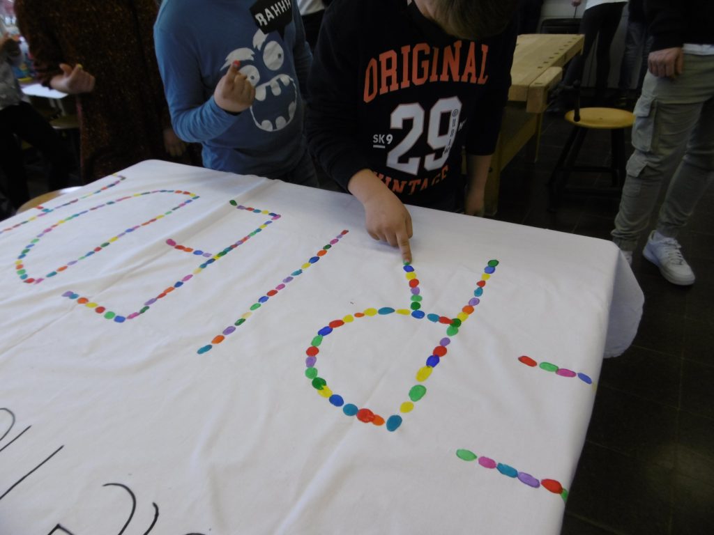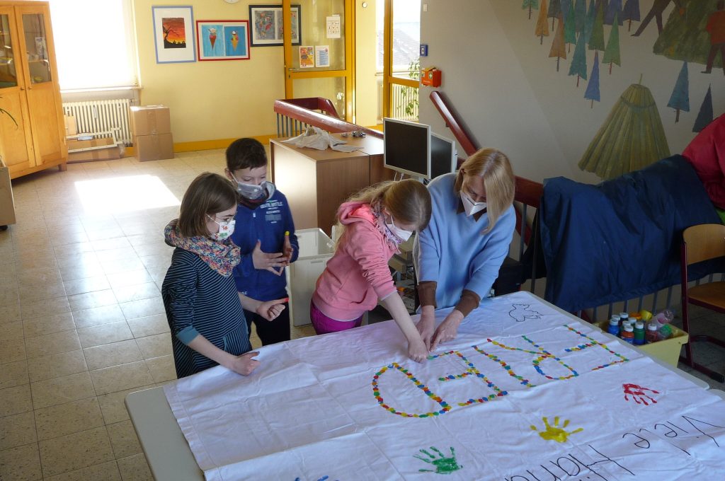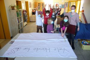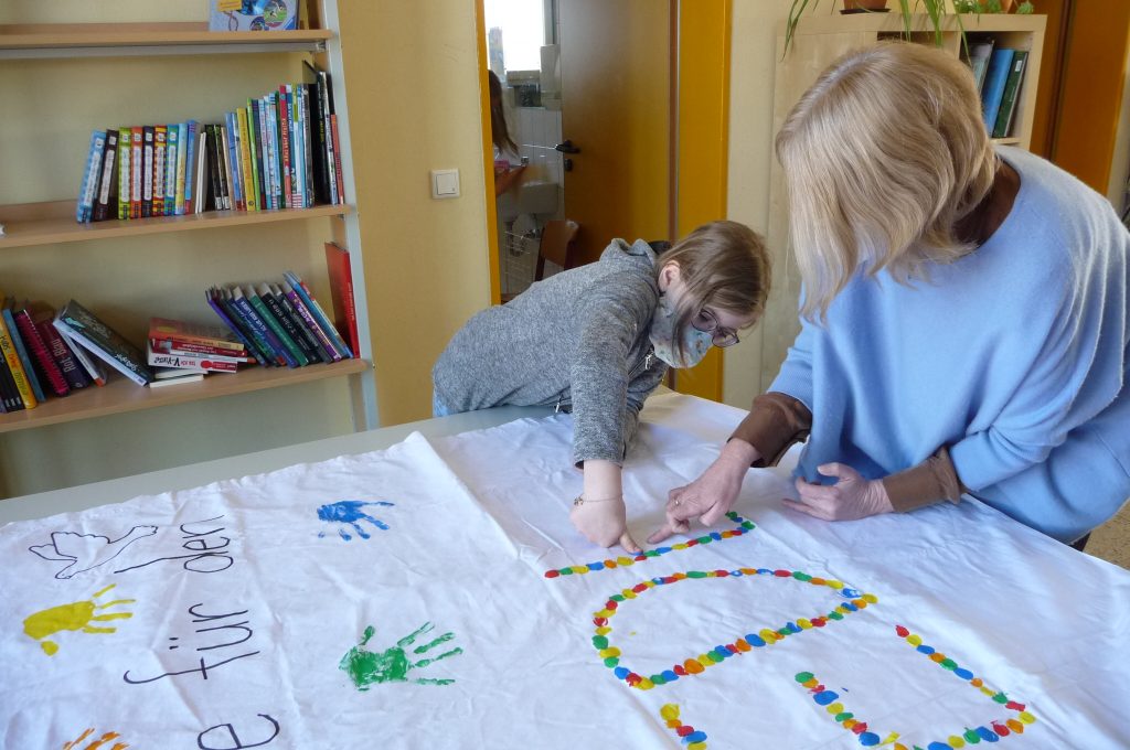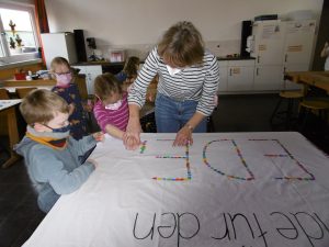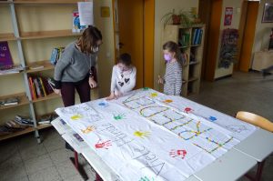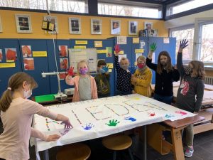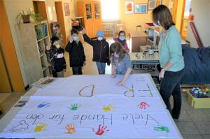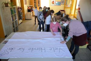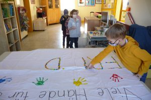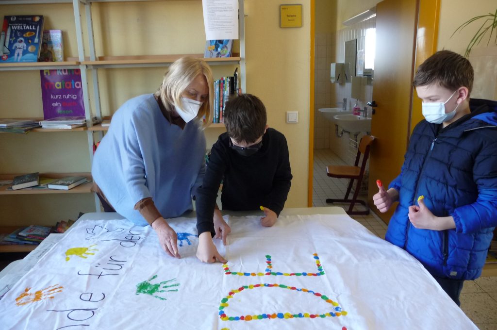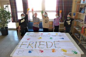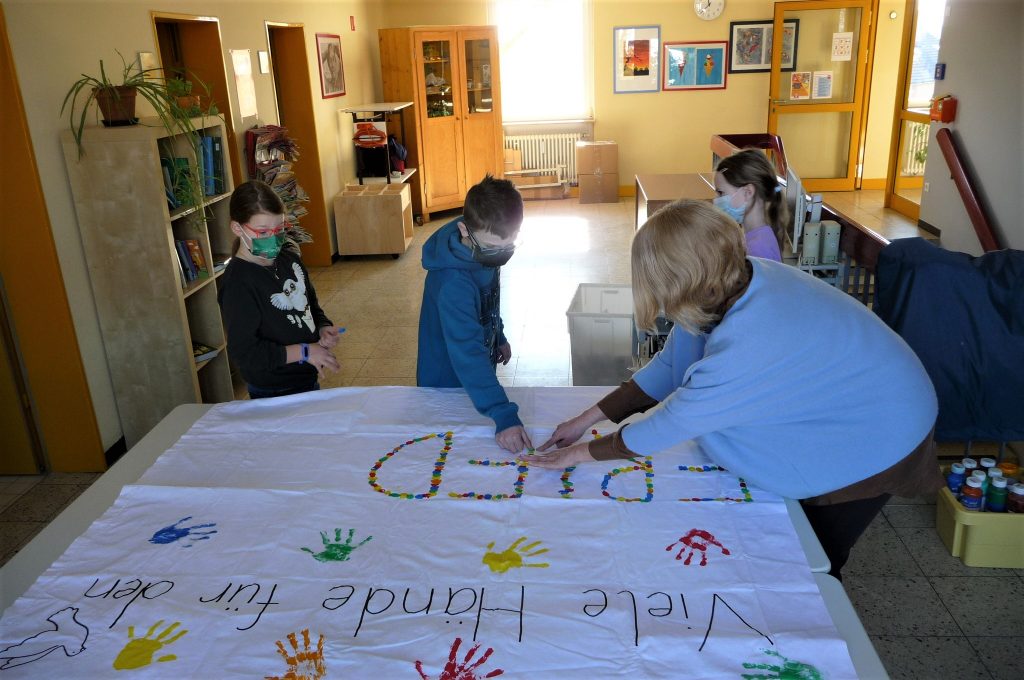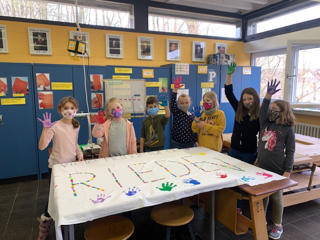 Nach den Faschingsferien kam in den Klassen immer wieder das Thema Ukraine auf. Aus den Reihen der Kinder kam da der Vorschlag ein Zeichen für den Frieden zu setzen. Nach kurzer Überlegung war die Idee „der vielen Hände für den Frieden“ geboren. Auf ein Leinentuch druckten die Kinder der Klassen ihre Hände und Finger ab. So entstand ein Zeichen, das nun den Eingangsbereich der Schulhäuser Kist und Altertheim schmückt. So werden alle in den Schulhäusern täglich an ein friedliches Miteinander im Kleinen und in der Welt erinnert.