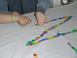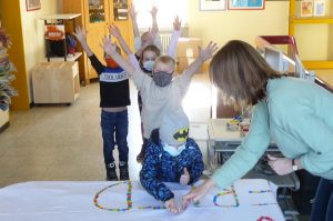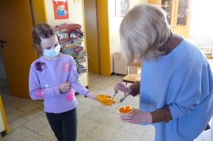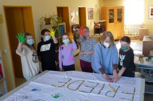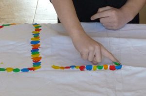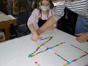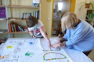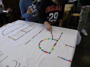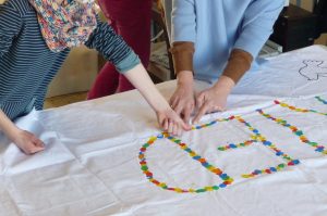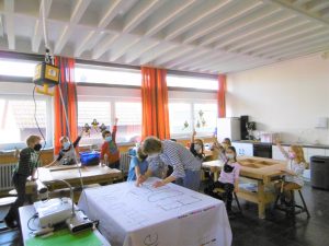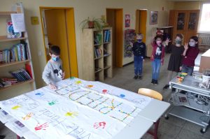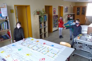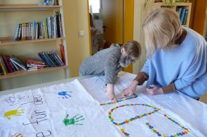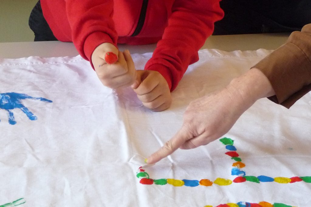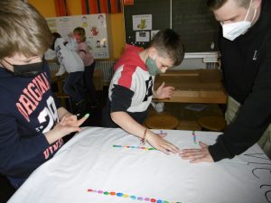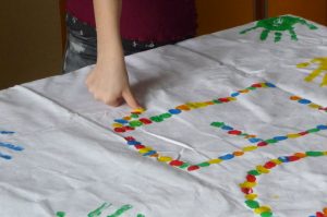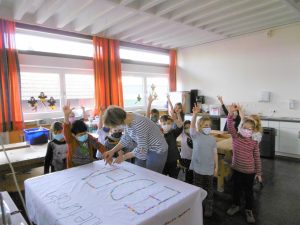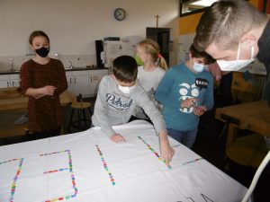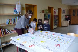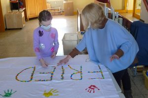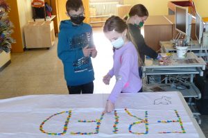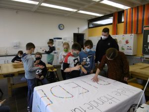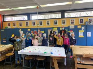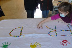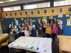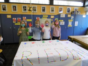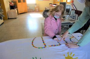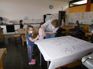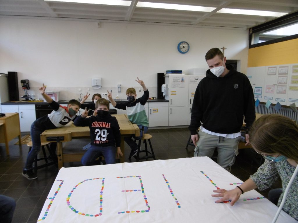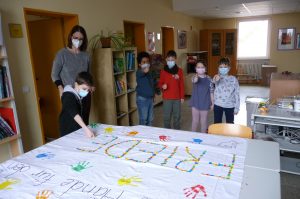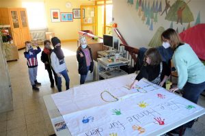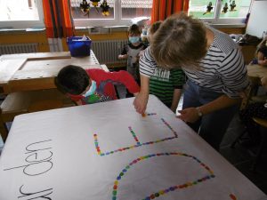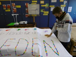 Nach den Faschingsferien kam in den Klassen immer wieder das Thema Ukraine auf. Aus den Reihen der Kinder kam da der Vorschlag ein Zeichen für den Frieden zu setzen. Nach kurzer Überlegung war die Idee „der vielen Hände für den Frieden“ geboren. Auf ein Leinentuch druckten die Kinder der Klassen ihre Hände und Finger ab. So entstand ein Zeichen, das nun den Eingangsbereich der Schulhäuser Kist und Altertheim schmückt. So werden alle in den Schulhäusern täglich an ein friedliches Miteinander im Kleinen und in der Welt erinnert.