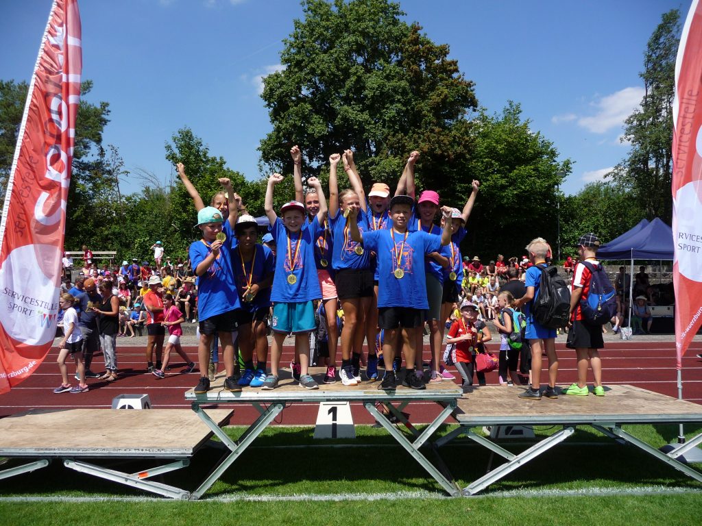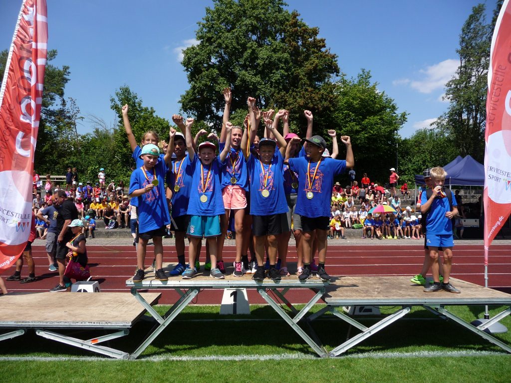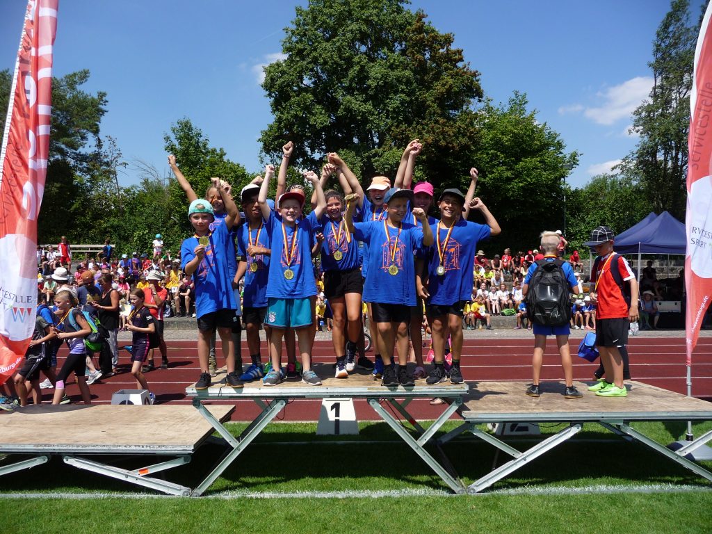 Die tollen Sportlerinnen und Sportler hatten sich gegen alle anderen Schulen durchgesetzt und den 1.Platz! erreicht. Belohnt wurde diese spitzen Leistung mit einem Kreissportmeister T-Shirt und natürlich mit der Goldmedaille.