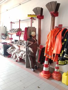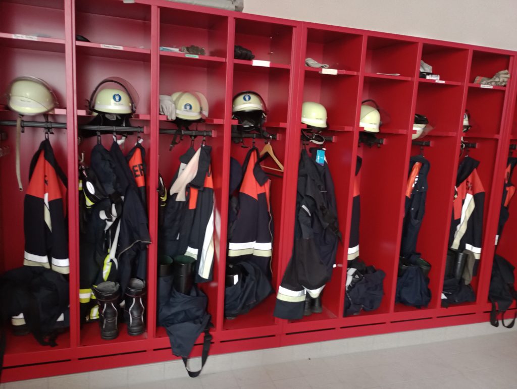 Jedes Mitglied der Feuerwehr besitzt seine eigene Ausrüstung im Wert von 1.000,- €. Sie besteht aus: Helm mit Nackenschutz, feuerfester Jacke, Hose mit Knieschützer, Handschuhe (kurz und lang), Stiefel mit Stahlkappen.