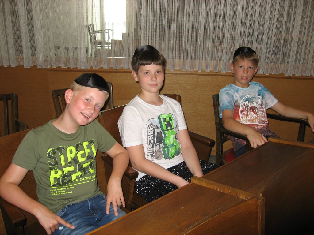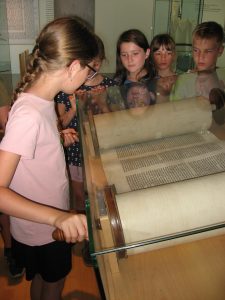 Zuerst besichtigten wir die Synagoge und erfuhren, wie es in einem jüdischen Gebetshaus aussieht. Bevor wir eintreten durften, mussten die Jungen eine Kippa aufsetzen. Bei unserem Rundgang durch das Museum bekamen wir erklärt, welche Feste die Juden feiern und was zu einem jüdischen Leben gehört. Wir sahen z.B. eine Torarolle, die wir selbst drehen durften. Der Museumsführer informierte uns auch über das koschere Essen. Fleisch- und Milchprodukte werden getrennt gekocht und es gibt sogar verschiedenes Besteck für unterschiedliche Gerichte.