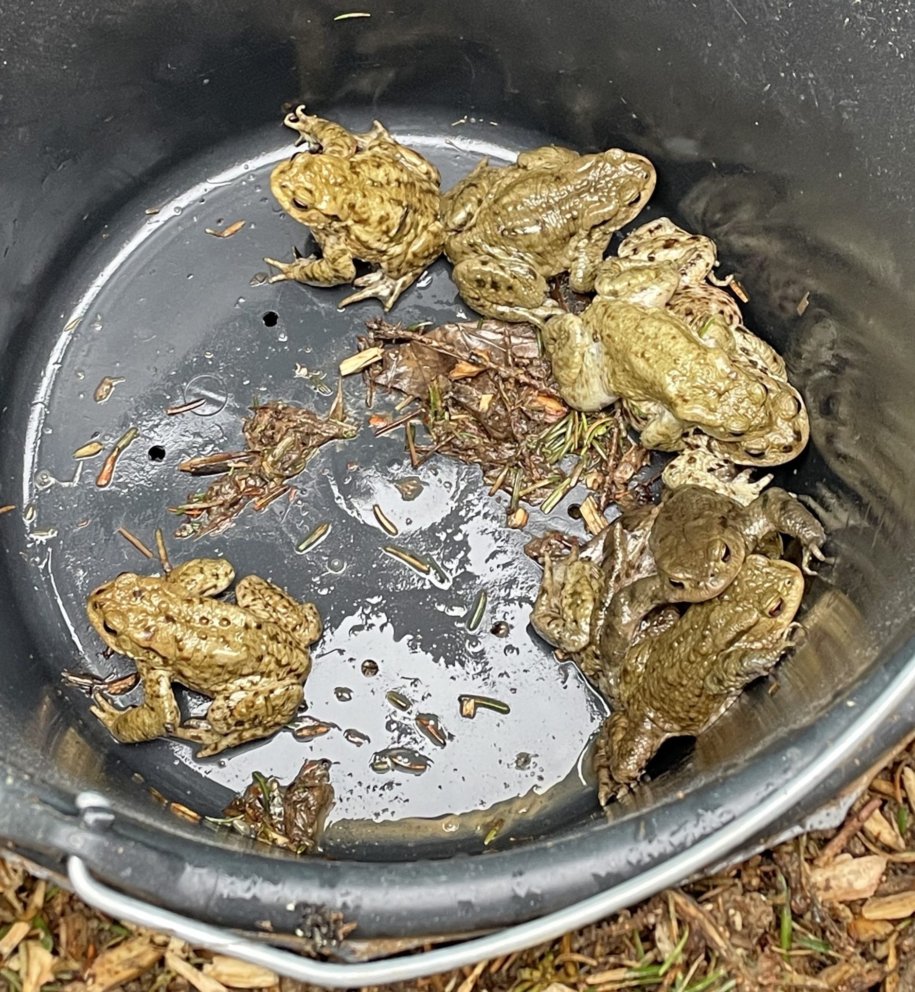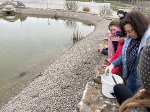 Sie informierte uns über zwei Krötenarten. Als nächstes liefen wir entlang des Zaunes, um in die vergrabenen Eimer zuschauen. Frau Raupp sammelte die Kröten aus den Eimern ein. Dabei erklärte sie uns, dass die Eimer Löcher haben, weil das Wasser in den Eimern dann ablaufen kann. Wir trugen die Kröten über die Straße zum Teich. Am Teich angekommen, ließen wir ein Krötenpaar und weitere elf Männchen ins Wasser. Manche Kinder konnten ein Krötenmännchen auf die Hand nehmen. Außerdem erzählte Frau Raupp uns, dass die Krötenweibchen 3000 – 7000 Kaulquappen bekommen können. Danach mussten wir leider wieder zurück in die Schule gehen.