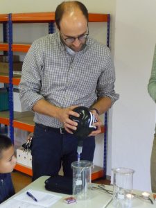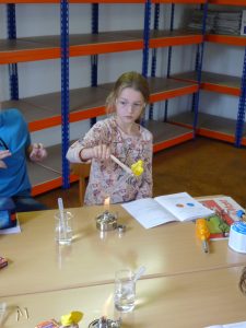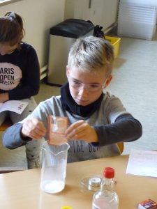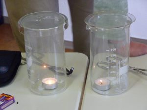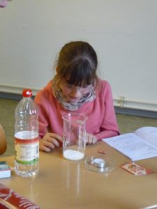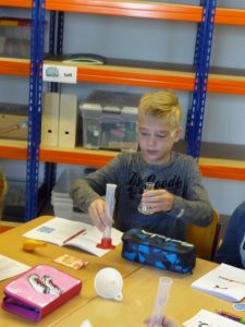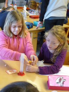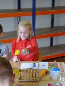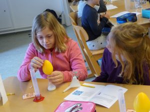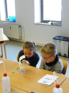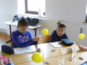 Der Ablauf des Projektes sah vor, dass die Schüler der gymnasialen Oberstufe den Viertklässlern im neu eingerichteten naturwissenschaftlichen Forscherhaus der Grundschule Kist Experimente zu den Themen Feuer, Wasser, Luft erläuterten. Mit Spannung und Vorfreude erwarteten die Grundschüler dieses nicht alltägliche Projekt. Fragen wie Kerzen verschwinden….?, Ist Luft gleich Luft?, Kann man mit Wasser eine Coladose zerquetschen? stießen auf großes Interesse und führten zu großem Erstaunen bei den Kindern. Sicherlich motiviert die Kooperation die Schüler, sich intensiv mit naturwissenschaftlichen Phänomenen zu beschäftigen. Die Zeit des Experimentierens verging für die kleinen Forscher wie im Flug.